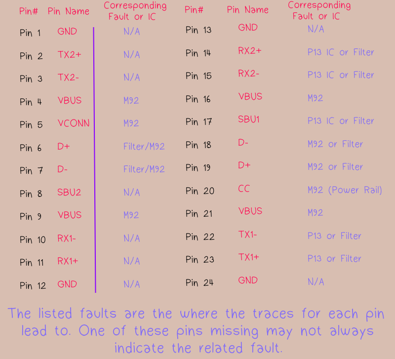 You can read these values with a Tail Insertion Tester or a 24 pin USB-C breakout board. If the diode reading is low or missing you can use this chart to pinpoint the fault.
