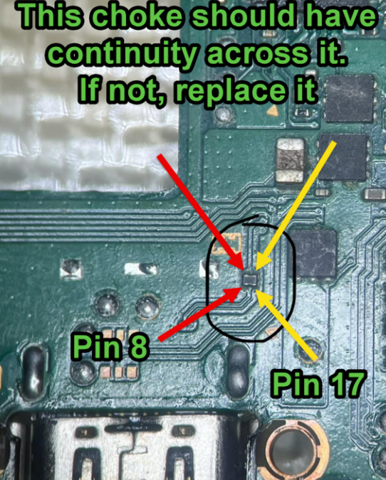 | No display when docked. | - If you have a mechanic port tester and pin 8 & 17 report 0L, test this choke:![]() - Can also be caused by a bad P13. On this model you can test the capacitor next to it to test. | Source Source | |
